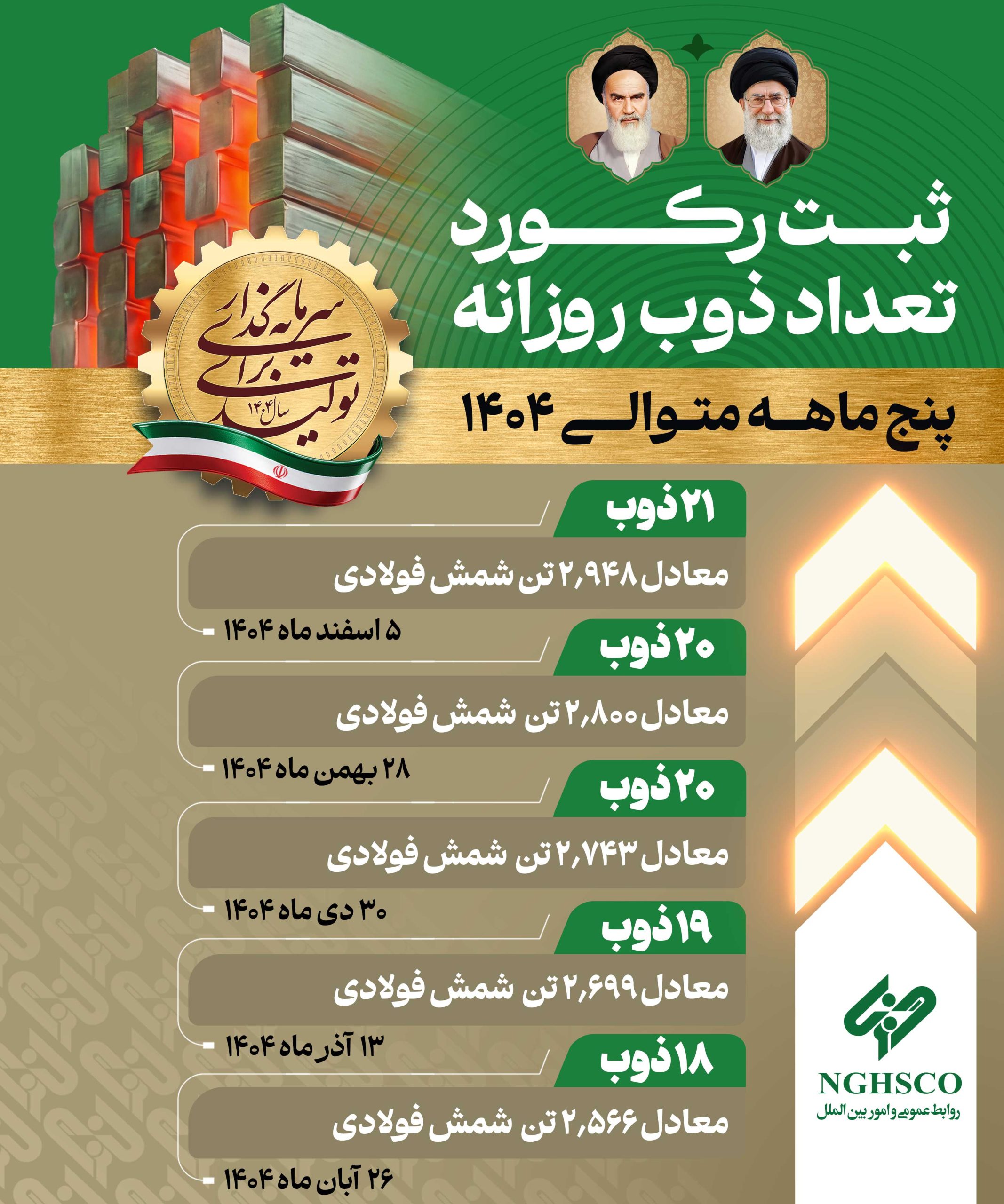 آخرین اخبار همزمان با 5 اسفند ماه روز مهندس تحقق یافت : “ثبت رکورد 21 ذوب وتولید 2948 تن شمش فولادی”اخبار25 فوریه 2026بیشتر بخوانیدتوسط فولاد غدیر نی ریز0 نظر1 دقیقه همزمان با 5 اسفند ماه روز مهندس تحقق یافت : “ثبت رکورد 21 ذوب وتولید 2948 تن شمش فولادی”اخبار25 فوریه 2026بیشتر بخوانیدتوسط فولاد غدیر نی ریز0 نظر1 دقیقه پنجم اسفندماه روز مهندس بر تمامی مهندسان متعهد، متخصص و پرتلاش تبریک و تهنیت باد .اخبار24 فوریه 2026بیشتر بخوانیدتوسط فولاد غدیر نی ریز0 نظر1 دقیقه بالاترین تولید ماهیانه ۳۰روزه در تاریخ واحد احیای مستقیم فولاد غدیر نی ریز ثبت شداخبار23 فوریه 2026بیشتر بخوانیدتوسط فولاد غدیر نی ریز0 نظر1 دقیقه نماینده مردم نی ریز، استهبان و بختگان در مجلس شورای اسلامی:فولاد غدیر نی ریز نمونه موفق هم افزایی صنعت و حوزه سلامتاخبار23 فوریه 2026بیشتر بخوانیدتوسط فولاد غدیر نی ریز0 نظر1 دقیقه تجهیز و افتتاح کلینیک پیشرفته شبانهروزی قطرویهاخبار23 فوریه 2026بیشتر بخوانیدتوسط فولاد غدیر نی ریز0 نظر1 دقیقه ثبت رکورد ۲۰ ذوب و تولید ۲۸۰۰ تن شمش فولادیاخبار21 فوریه 2026بیشتر بخوانیدتوسط فولاد غدیر نی ریز0 نظر1 دقیقه سومین برد تیم والیبال فولاد غدیر نیریز در لیگ برتر فارساخبار21 فوریه 2026بیشتر بخوانیدتوسط فولاد غدیر نی ریز0 نظر1 دقیقه کسب رکورد تولید ماهیانه تولید شمش در بهمن ماهاخبار21 فوریه 2026بیشتر بخوانیدتوسط فولاد غدیر نی ریز0 نظر1 دقیقه آخرین عرضه شمش فولادی با گریدهای آلیاژِیاخبار19 فوریه 2026بیشتر بخوانیدتوسط فولاد غدیر نی ریز0 نظر1 دقیقه ثبت رکورد ۲۰ ذوب در روز در فولاد غدیر نی ریزاخبار19 فوریه 2026بیشتر بخوانیدتوسط فولاد غدیر نی ریز0 نظر1 دقیقه ثبت رکوردی جدید در واحد فولادسازی با ۱۴ ذوب در یک سکوئنساخبار18 فوریه 2026بیشتر بخوانیدتوسط فولاد غدیر نی ریز0 نظر1 دقیقه پیام مدیرعامل شرکت فولاد غدیر نیریز به مناسبت یومالله ۲۲ بهمناخبار10 فوریه 2026بیشتر بخوانیدتوسط فولاد غدیر نی ریز0 نظر2 دقیقه وقتی کیفیت، بازار را فتح میکند؛ صدرنشینی فولاد غدیر نیریز در بورس کالااخبار29 ژانویه 2026بیشتر بخوانیدتوسط فولاد غدیر نی ریز0 نظر2 دقیقه مدیر عامل شرکت فولاد غدیر نی ریز خبر داد : هشتمین سال بهره برداری، نقطه عطفی در مسیر رشد اقتصادی و صنعتی با ثبت شرکت به عنوان سهامی عاماخبار27 ژانویه 2026بیشتر بخوانیدتوسط فولاد غدیر نی ریز0 نظر2 دقیقه اولین عرضه اعتباری چهارماهه فولاد غدیر نیریز با تحویل کمتر از یک ماهاخبار25 ژانویه 2026بیشتر بخوانیدتوسط فولاد غدیر نی ریز0 نظر1 دقیقه فولاد غدیر نی ریز پیشگام در پاکسازی محیط زیست در هفته هوای پاکاخبار24 ژانویه 2026بیشتر بخوانیدتوسط فولاد غدیر نی ریز0 نظر1 دقیقه ثبت رکورد تولید ماهانه و روزانه شمش فولادی در غدیر نی ریز اخبار21 ژانویه 2026بیشتر بخوانیدتوسط فولاد غدیر نی ریز0 نظر1 دقیقه پایان موفقیتآمیز تعمیرات اساسی سالیانه شرکت فولاد غدیر نیریزاخبار20 ژانویه 2026بیشتر بخوانیدتوسط فولاد غدیر نی ریز0 نظر2 دقیقه امضای تفاهمنامه همکاری میان بانک گردشگری و شرکت فولاد غدیر نیریزاخبار4 ژانویه 2026بیشتر بخوانیدتوسط فولاد غدیر نی ریز0 نظر1 دقیقه مجمع عمومی عادی سالیانه فولاد غدیر نی ریز برگزار شداخبار1 ژانویه 2026بیشتر بخوانیدتوسط فولاد غدیر نی ریز0 نظر2 دقیقه اهدای خون کارکنان شرکت فولاد غدیر نیریز در راستای ایفای مسئولیت اجتماعیاخبار24 دسامبر 2025بیشتر بخوانیدتوسط فولاد غدیر نی ریز0 نظر1 دقیقه با هدف ترویج فرهنگ مطالعه بین کودکان و نوجوانان صورت گرفت؛ توزیع ویژهنامه یلدایی شرکت فولاد غدیر نیریزاخبار22 دسامبر 2025بیشتر بخوانیدتوسط فولاد غدیر نی ریز0 نظر2 دقیقه ثبت رکورد تولید ماهانه شمش فولادی در غدیر نی ریزاخبار22 دسامبر 2025بیشتر بخوانیدتوسط فولاد غدیر نی ریز0 نظر1 دقیقه درخشش شرکت فولاد غدیر نیریز در سومین رویداد استانی جوانی جمعیت فارساخبار22 دسامبر 2025بیشتر بخوانیدتوسط فولاد غدیر نی ریز0 نظر2 دقیقه توسط فولاد غدیر